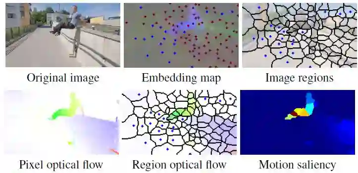 图中:第一行:左边是一幅图像。 中间:将嵌入图投影到RBG空间(通过PCA),其中初始背景种子SBG标记为蓝色,其他种子为红色。 右:嵌入图中每个种子附近的区域。 第二行:左边是光流。 中间:每个区域内的平均流量。 右:运动显著性分数图。