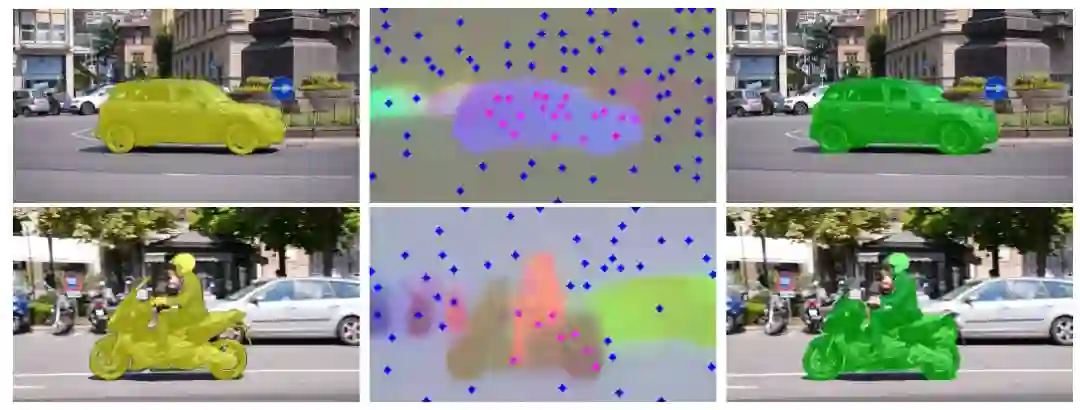 图1:根据运动来改变视频中分割目标(前景)的示例。 在第一行,汽车是视频中的前景,在第二行,汽车则是视频中的背景。 为了解决这个问题,提出的方法首先获得物体实例的嵌入,并识别用于区分前景/背景的代表性嵌入,然后基于代表性嵌入来分割帧。 左: groundtruth。 中:通过PCA投影到RGB空间的嵌入的可视化,以及用于前景(洋红色)和背景(蓝色)的代表性点。 右:由所提出的方法产生的分割mask。