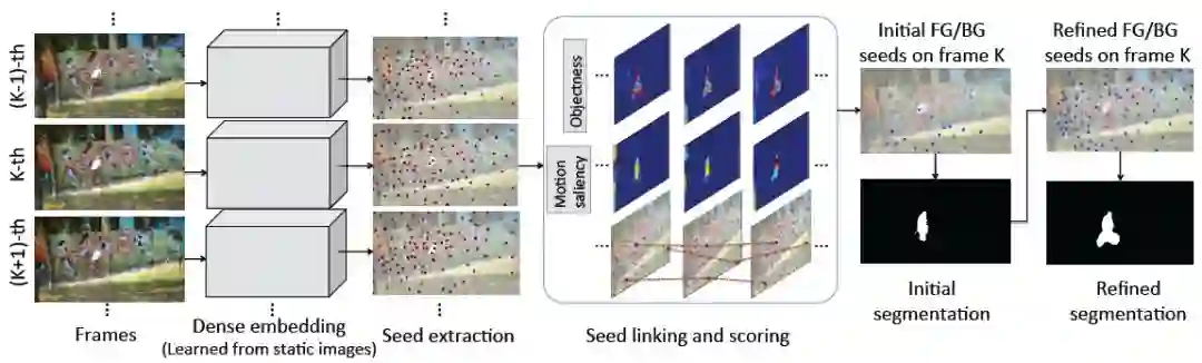 这是所提出的方法概览图。 给定视频序列,通过在静态图像上训练的实例分割网络来获得密集嵌入。 然后获得代表性的嵌入,称为种子。 种子在整个序列中连接起来(我们在这里显示连续3帧)。 选择基于物体和运动显着性得分最高的种子作为初始种子(品红色)以产生初始分割。 最后,识别更多的前景种子以及背景种子来改善分割。