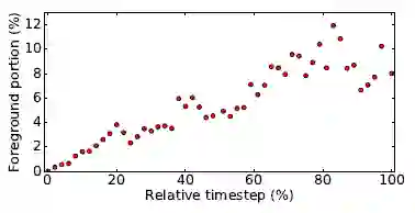 图6:错误分类的前景嵌入与相对时间步的比例。 随着时间的推移,更多的前景嵌入比前景本身更接近第一帧的背景。