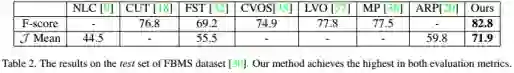 表2:在FBMS数据集测试集上的结果。 提出的方法在评估指标上达到了最高水平。
