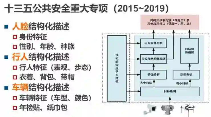 目前在实施的十三五这个重大项目,继续深化视频结构化技术,包括人脸结构化、身份特征、性别、年龄、种族等等;行人结构化描述,包括人体各个部位和携带物的描述;以及车辆结构化 – 这些是现在视频大数据中最关注的问题。