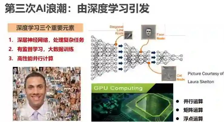 现在 AI 第三次浪潮是由深度学习引发的。深度学习有三个非常重要的要素:第一是深层神经网络,神经网络并不是一个新东西,只是现在做得更深,能解决更复杂的问题;第二是有监督的学习,大数据训练;第三是高性能并行计算。