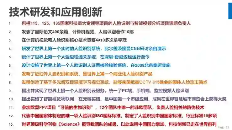中科奥森团队有很多 No.1 的创新和发明,包括国家项目、论文发表、核心技术,我们设计并实施了世界上第一个实时人脸识别系统,世界上第一个大规模的生物识别自助通关系统,世界上第一个人脸识别门票核验系统,世界上第一个实用化人脸识别设备产品(近红外),双目人脸防伪设备(可见光+近红外),这些都是中科奥森的首创。