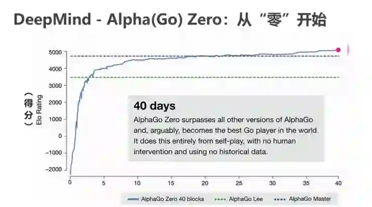 大家听过 AlphaGo,早期他们用大量的标注数据,用各种各样的棋局进行训练,打败了李世石、柯洁。2017 下半年,他们推出了 Alpha(Go) Zero 采用零标注数据,仅利用走棋和胜负判断规则,进行自主强化学习。AlphaZero 在训练第 3 天打败李世石,第 21 天打败柯洁,第 40 天打败所有人类。后来他们不仅用这一技术下围棋,还下其它的棋以及玩游戏,也取得了很大成功。