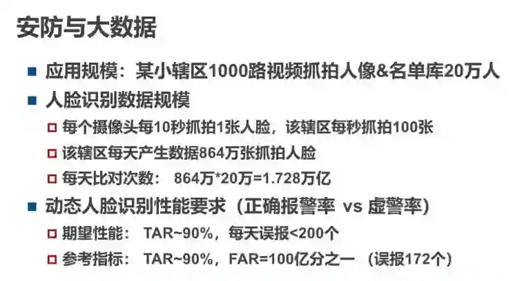 首先从应用规模来看数据规模,我以一个辖区为例,假设有 1000 路视频,在深圳大概是一个村镇的规模,用来抓拍人像,与 20 万人的黑名单库做比对。假设每个摄像头每 5 秒抓拍一张人脸,该辖区每秒钟抓拍 200 张图像,每天产生 0.173 亿张抓拍人脸,跟 20 万人的库的比对次数是 0.173 亿*20 万,约 3.456 万亿次。业务上希望正确识别率不低于 90%。