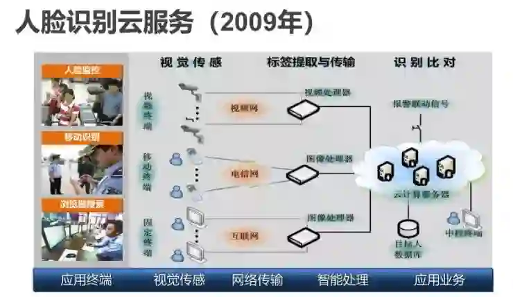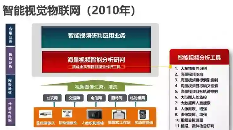 2010 年我提出了智能视觉物联网的概念,是人脸识别云服务的进一步拓展。最底层是数据入口,由各类视觉传感器采集数据,通过互联网、电信网、公安内网等汇集到公安的数据平台,进行数据的图象汇聚和清洗,然后对视频数据进行智能分析,其中包括各种视频分析工具,最上层是应用业务,如人脸识别、视频研判。