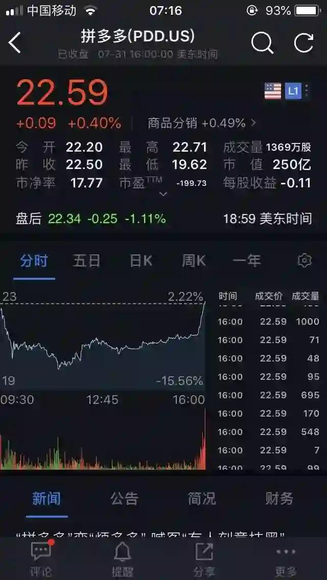 然而中盘后拼多多股价开始回升,最终收报22.59美元,微涨0.40%,市值为250.25亿美元。