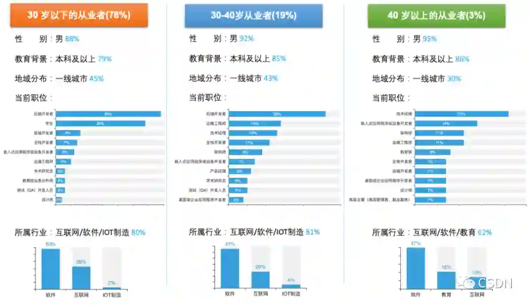 被圈内称作“35 岁危机”的 30-40 岁从业者从去年报告中 16% 的占比提升至 19%——35 岁可能已并不再是程序员“魔咒”。