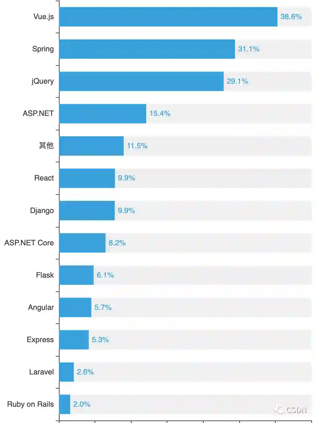 Web 框架方面,Vue.js 依旧稳居第一,但值得注意的是:Vue.js 使用者从去年不到 30% 的占比已增至 38.6%。可见随着 Vue 3.0 的普及,程序员圈中愈发流行用 Vue.js 进行 Web 开发。