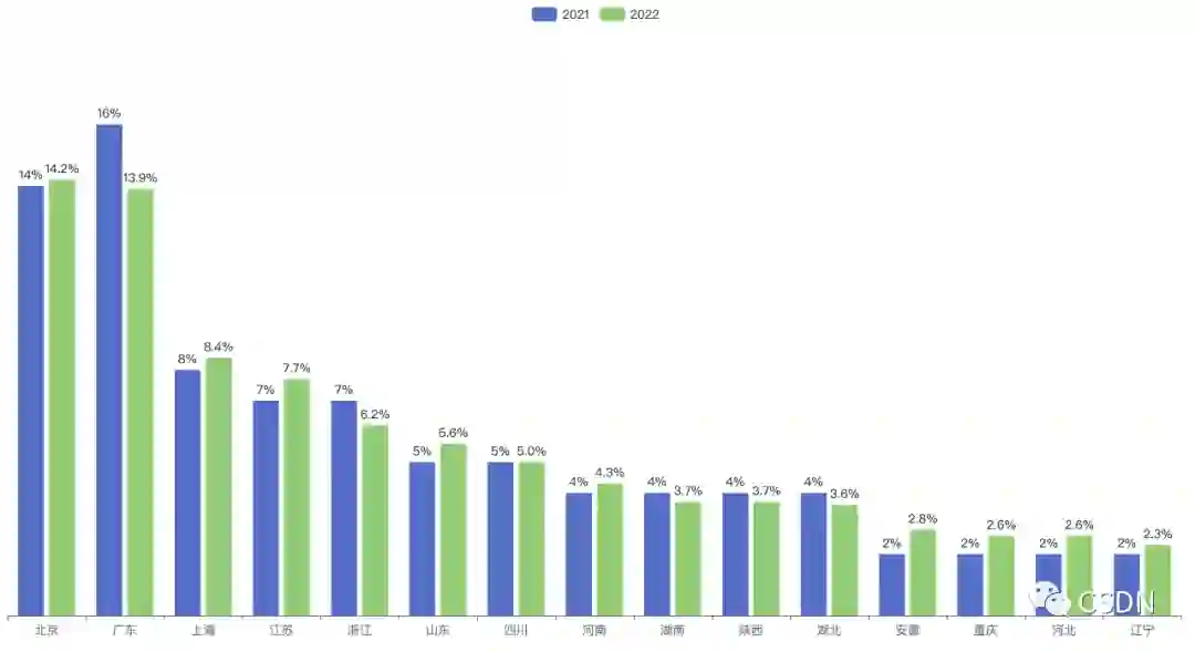 尤其是北京和广东,光这两个省市的开发者占比就能达到全国总数的 28.1%。另外值得一提的是,2020 年广东以拥有全国 16% 的开发者位列全国第一,而如今这一宝座已由北京以 14.2% 的占比拿下。