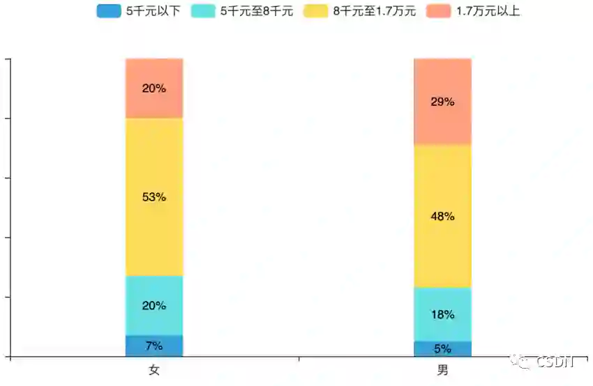 在遍地男性的开发者圈中,女性开发者薪资是否会与男性一致?答:有一定差异,但差距不大。在月薪超过 1.7 万元的区间中,男性开发者占比为 29%,而女性开发者中也有 20% 的人拿着同样薪资待遇。甚至在 8 千至 1.7 万元薪资范围内,女性开发者的占比还略高于男性开发者。