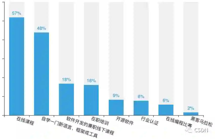 具体怎么学?作为互联网的弄潮儿,程序员群体最为常见的学习路径便是参加在线课程。在汲取新知识面前,57% 的开发者会选择参加在线学习课程,同时有 48% 的开发者更倾向于通过自学来掌握一个新的编程语言、框架或工具。