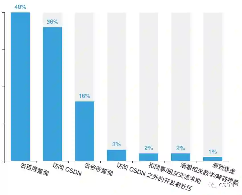 学会解决工作或学习中遇到的问题也是程序员必备技能之一。数据显示,近四成开发者遇到问题后会去百度查询解决方案,其次还有 36% 的开发者选择前往 CSDN 寻求帮助。