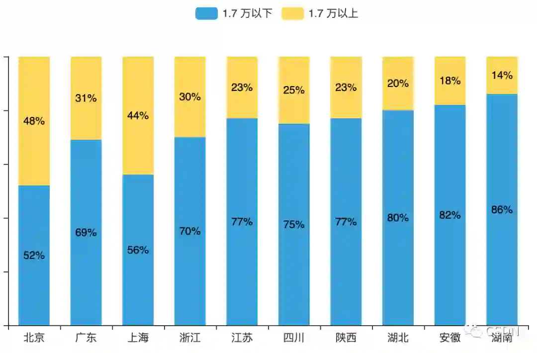 图12 月薪高于1.7万在各地区中人数占比