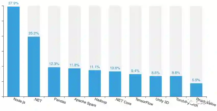 开源吞噬世界,与此同时开源工具正在吞噬开发者。数据显示,过去一年有 37.9% 的开发者在使用开源技术框架 Node.js,而作为谷歌开源的 TensorFlow 和 Facebook(现 Meta)主力支持的 PyTorch,这二者的使用占比也在缓慢上升。