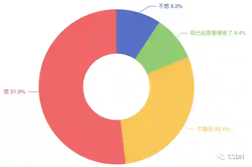 然而随着年龄增长,多数程序员都会在自身技术得到充实后,面临一个艰难的抉择:坚持技术岗 vs. 转为管理岗。有人感慨“技术和体力跟不上了,只能做管理”,也有人呼吁“坚持自己的技术才是根本”。面对这一难题,33.8% 的开发者选择会坚持技术岗直到退休。但也有 51.9% 的开发者想成为一名管理者。