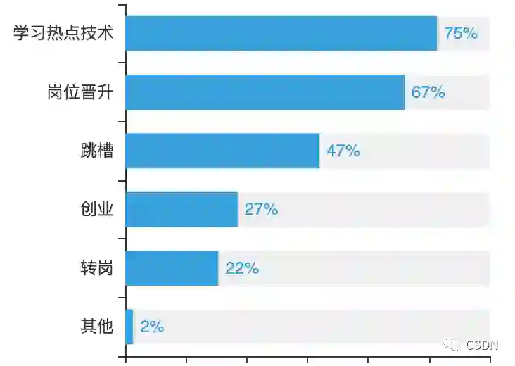 为了寻求更高的职级和更好的待遇,程序员普遍会采用三种方式:一是学习热点技术(75%),二是岗位晋升(67%),三是跳槽(47%)。