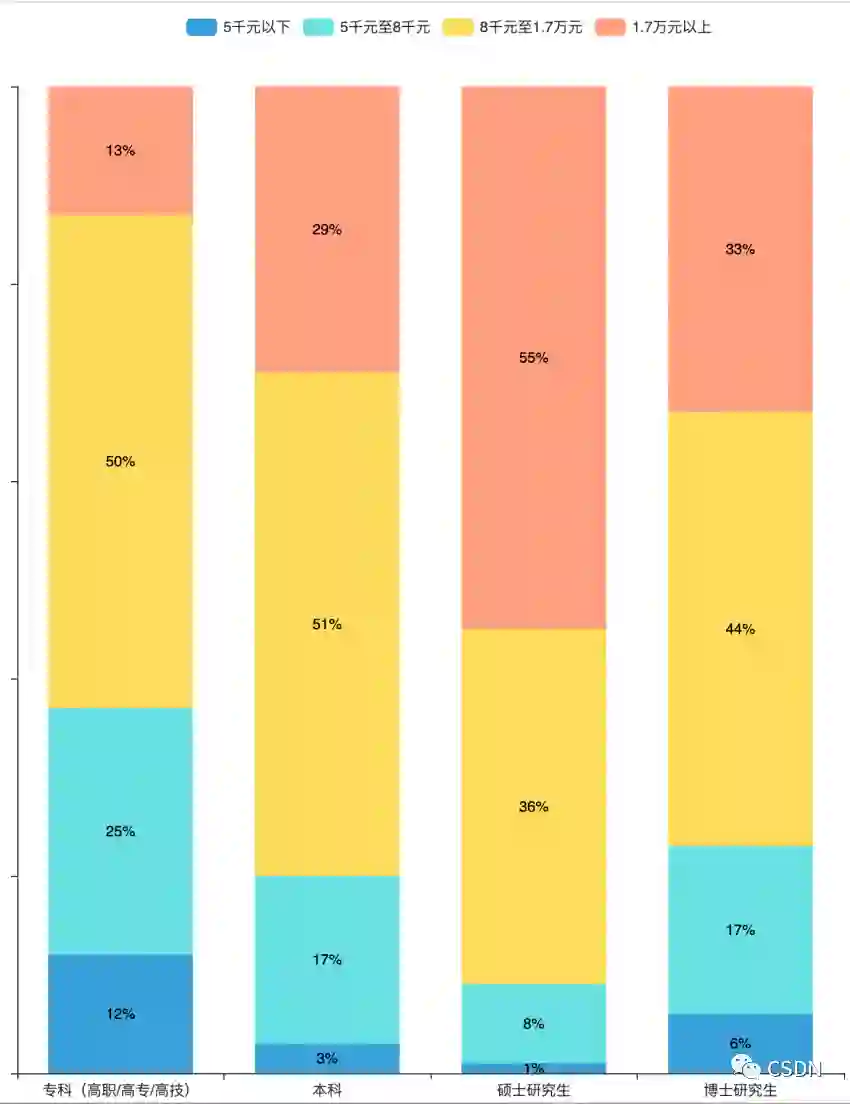 从数据上来看,学历越高,高收入群体的占比也就相对较高。例如学历为硕士研究生的开发者中,薪资达到 1.7 万元以上的就有 55%。