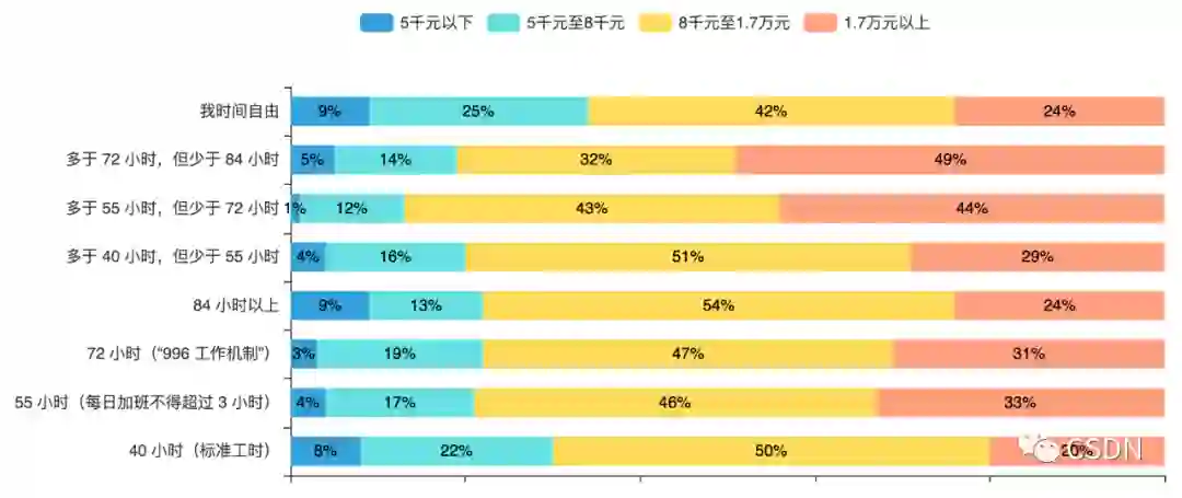 报告数据显示,按照每周 40 小时标准工时工作的程序员中,仅有 20% 的人薪资高于 1.7 万元;而工作时长在 72-84 小时的程序员中,收入超过 1.7 万元的近一半。