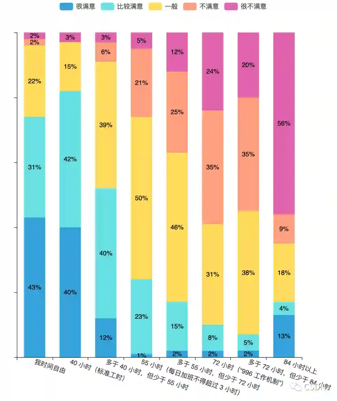 正所谓“鱼和熊掌不可兼得”,虽然标准工时下很难拿到高薪,但依旧有三成程序员选择每周只工作 40 小时,他们也很少对工时有所不满。相比之下,工作时间越长,开发者的不满意度越高,例如每周工作 72-84 小时的程序员中,就有 55% 的人对工时不满。