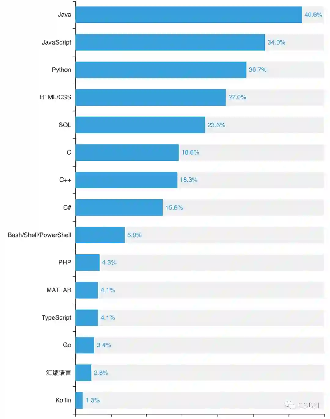 在与程序员息息相关的编程语言方面,根据数据显示,使用 Java 的开发者数量正在逐年降低:与去年 50% 的用户量相比,今年 Java 开发者人数降至 40%——这一点也印证了 TIOBE 编程语言排行榜中 Java 流行度逐渐下降这一现象。