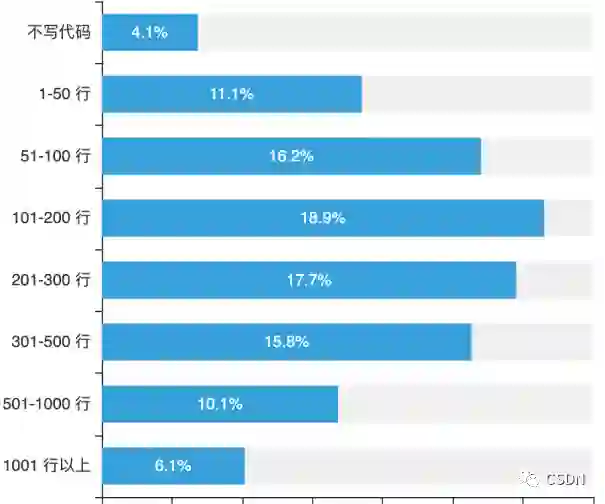只有不到 10% 的开发者会每天花费 70% 以上的时间写代码,并且大多开发者平均每天只写 200 行代码左右。