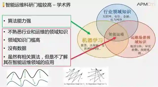 虽然学术界研究人员的算法能力相对较强,但是他们往往不熟悉行业和运维领域的相关知识。而智能运维处于三个领域的交叉部分。这就导致智能运维的门槛比较高,需要花大量的时间和精力才能进入智能运维领域。