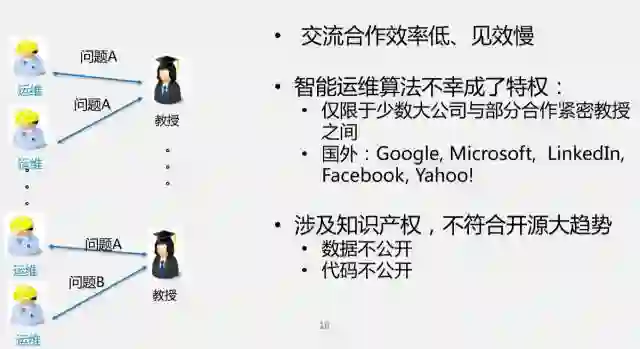 智能运维需要工业界和学术界的密切合作,但是目前仍只限于一对一相对低效的合作,少数公司和少数教授的特权不符合我们大的开源开放的趋势。