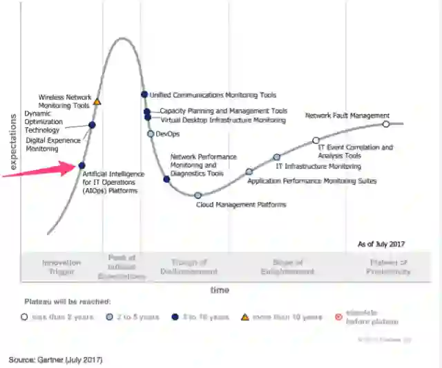 根据 Gartner Report,智能运维相关的技术产业处于上升期。2016 年,AIOps 的部署率低于 5%,Gartner 预计 2019 年 AIOps 的全球部署率可以达到 25%。所以,AIOps 的前景一片光明。