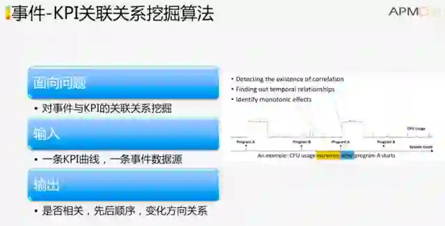 另外就是事件和 KPI 的关联关系,比如程序启动的事件,在某个时间点程序 A 启动了,下个时间点程序 B 启动了。在程序 A 每次启动的时候 CPU 利用率就上了一个台阶,而 B 没有。