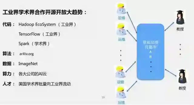 在算法层面,当前有 arXiv 共享算法(论文)平台,和 Github 代码共享;在数据层面,ImageNet 等数据共享平台对机器学习算法的研究起到了巨大的推动作用;在计算能力层面,各大公司都建立了 AI 云;在人才层面,我们也可以看到,学术界和工业界的人才流动比原来顺畅多了。