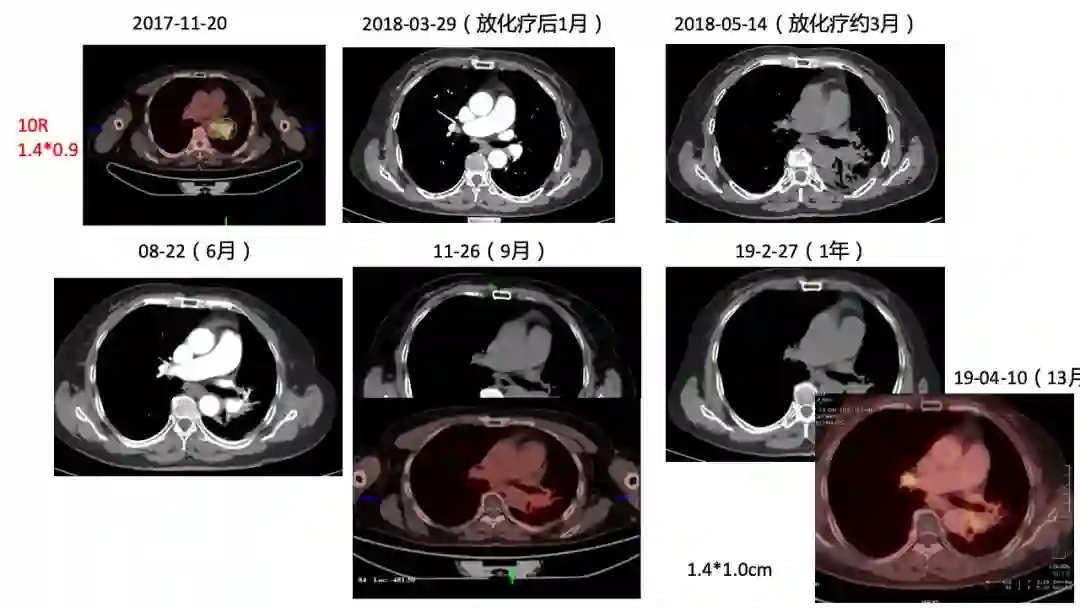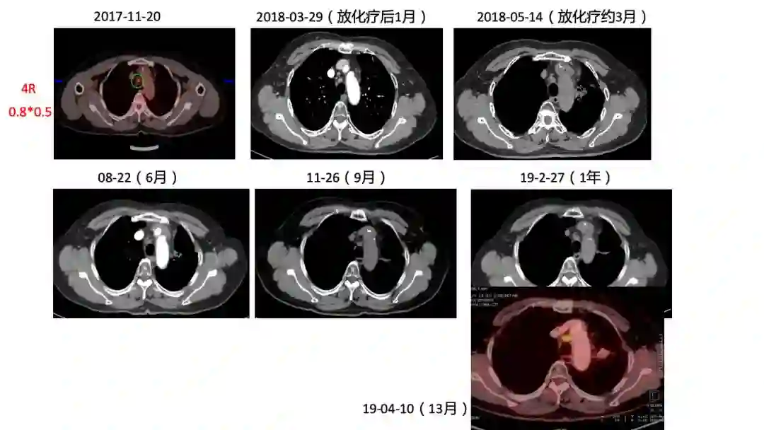 5)4R,10R组LN(非放疗区)1年来随访大小未见变化,4R实性程度增高,代谢增高2倍。