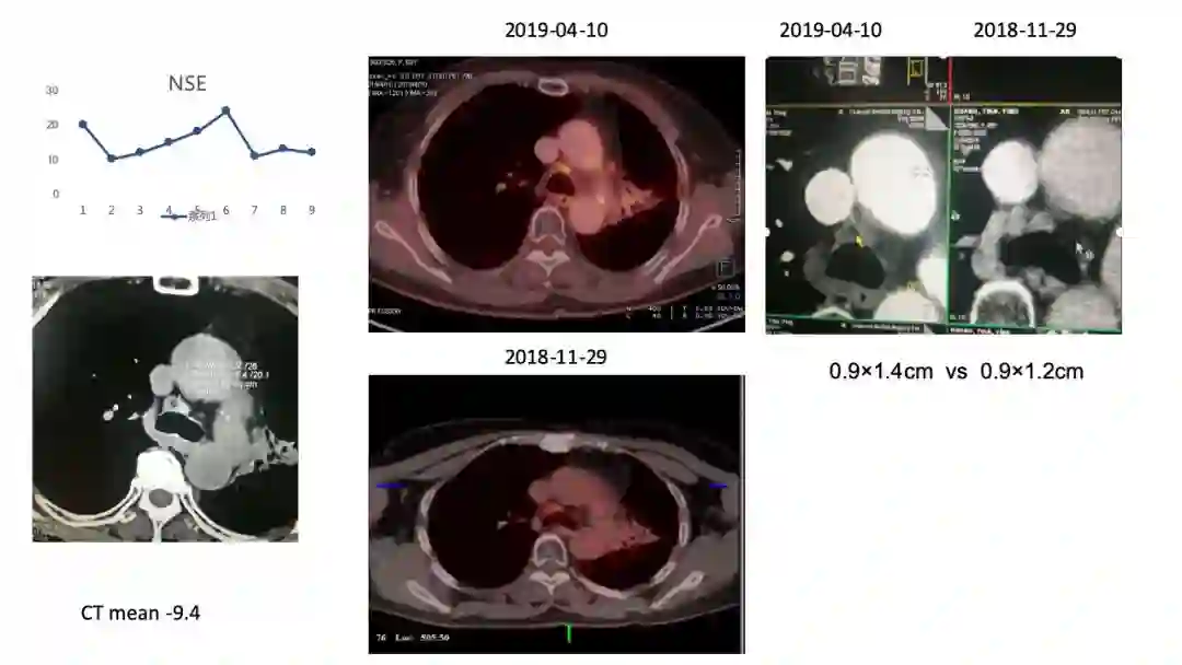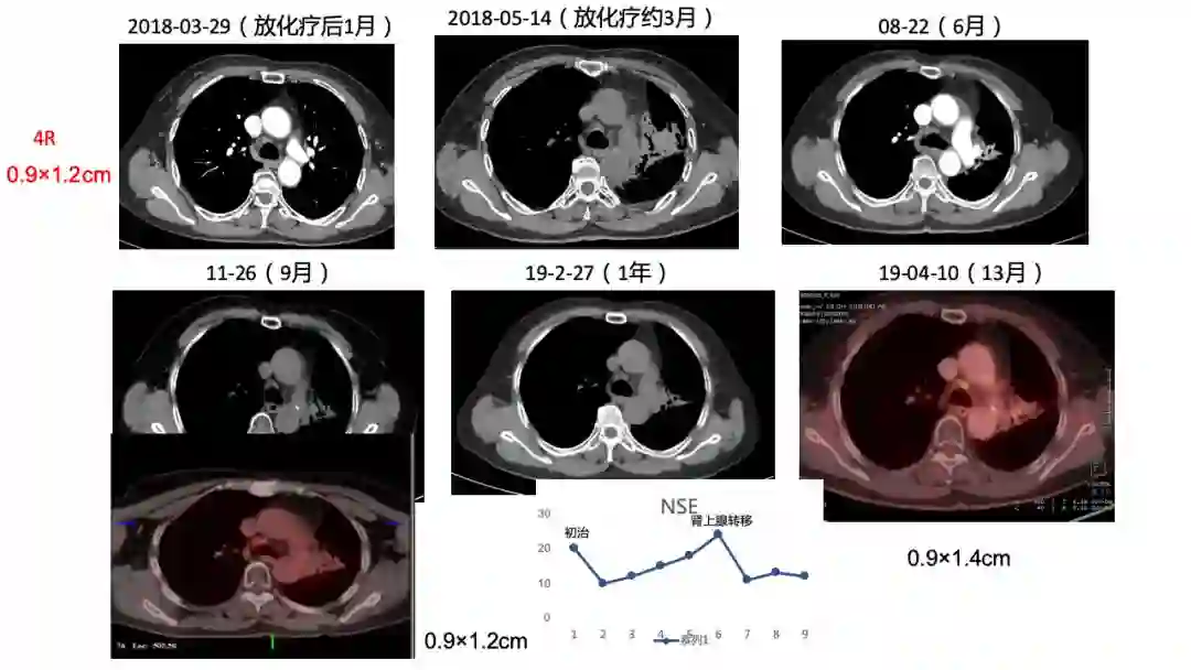 初诊时4R,10R LN增大,PET考虑炎症,未行放疗,随访期间淋巴结大小无变化,NSE稳定正常,建议观察,3个月后复查CT。