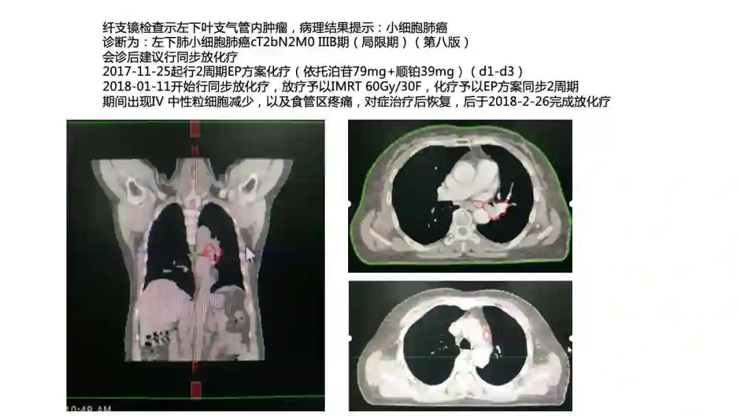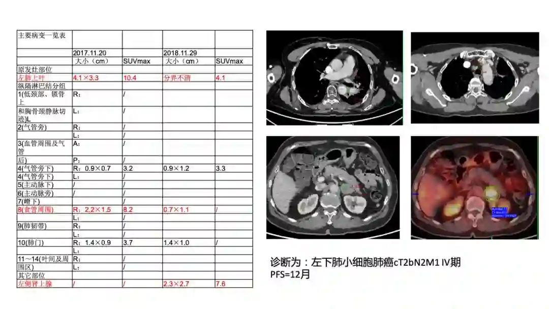 2)诊断:左下肺小细胞肺癌cT2bN2M1 IV期 PFS=12月。
