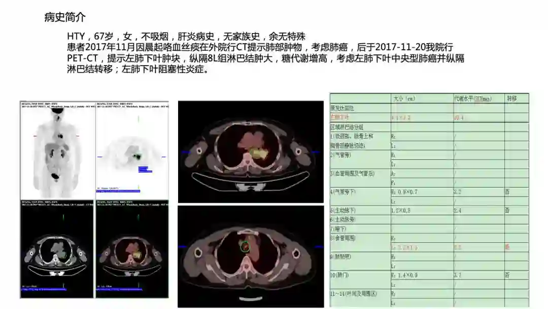 2)患者2017年11月因晨起咯血丝痰在外院行CT提示肺部肿物,考虑肺癌,后于2017-11-20我院行PET-CT,提示左肺下叶肿块,纵隔8L组淋巴结肿大,糖代谢增高,考虑左肺下叶中央型肺癌并纵隔淋巴结转移;左肺下叶阻塞性炎症。