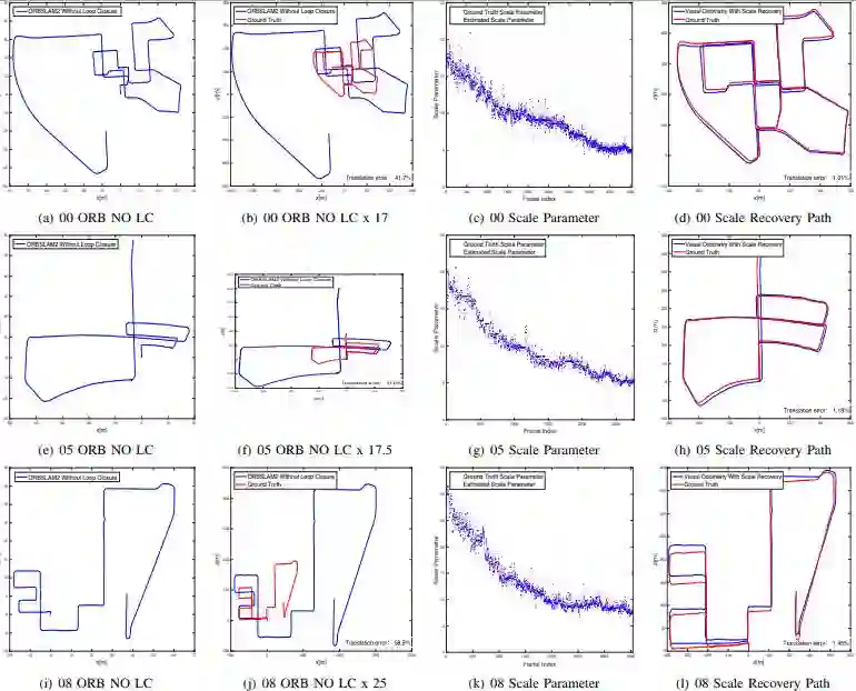 图5,在KITTI数据集的00,05,08序列上的尺度恢复性能比较。第一列是单目无闭环的ORB-SLAM2的结果;第二列是单目ORB-SLAM2分别乘以固定尺度参数17,17.5,25的结果;第三列是用我们提出的方法乘以它们的尺度参数结果。