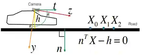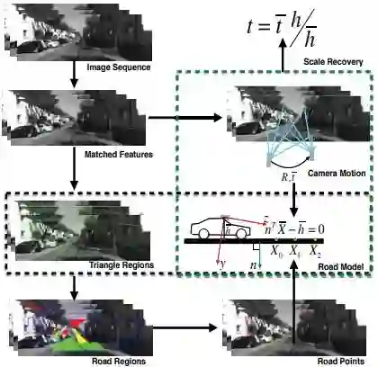 尺度恢复是单目视觉里程(VO)计的基本问题之一。摄像机高度通常用作恢复尺度的绝对参考。在这种情况下,尺度恢复的精度取决于道路区域检测和道路几何模型计算的准确性。在以前的工作中,道路检测和道路几何模型计算是依次地被解决:道路几何模型计算基于道路检测,道路区域检测基于颜色信息。但是,道路的颜色信息不够稳定。