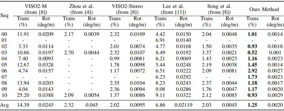表1,我们的方法与KITTI数据集上的其它视觉里程计方法的在平移和旋转误差方面的比较。