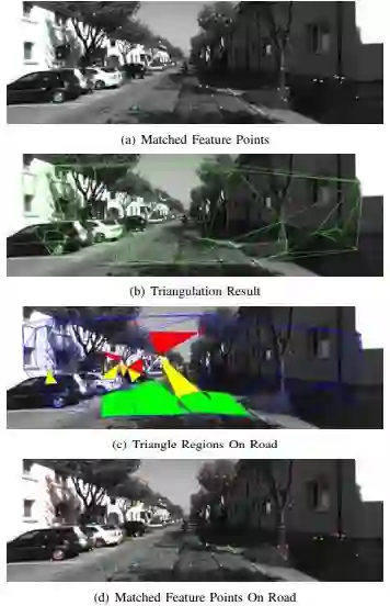 在(我们)提出的方法中,将估计的道路几何模型作为反馈考虑进去,以检测道路区域。因此,道路区域检测和道路几何模型估计可以使相互受益。使用Delaunay三角剖分方法将输入图像分割为多个三角形,并将匹配的特征点作为顶点。通过比较三角区域的几何模型与道路的几何模型,以决定是否将将每个三角区域分类为道路区域,道路几何模型在线被更新。