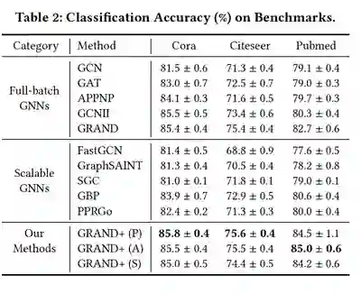 为了验证 GRAND+的预测效果及运行效率,我们选取了 7 个不同大小的图数据集对其进行了评测,并选择了 5 个经典的全批量(Full-batch)GNN 模型 GCN、GAT、APPNP、GCNII、GRAND 以及 5 个代表性的可扩展 GNN 模型 FastGCN、GraphSAINT、SGC、GBP、PPRGo 作为基线方法进行对比。实验结果显示,GRAND+在 3 个基准数据集上超越了所有 10 种基线方法,在另外 4 个较大规模的数据集上超越了 5 种可扩展的 GNN 模型,并具有良好的运行效率。值得一提的是,GRAND+在 Pubmed 上达到了 85% 的预测准确率,比 GRAND 高了 2.3%。在千万级节点数据集 MAG-Scholar-C 上,GRAND+可以在 10 分钟之内对完成训练及预测过程,比 FastGCN 和 GraphSAINT 快了近 10 倍;与此前谷歌提出的 PPRGo 模型相比,GRAND+以相近的运行时间取得了 4.9% 的效果提升。