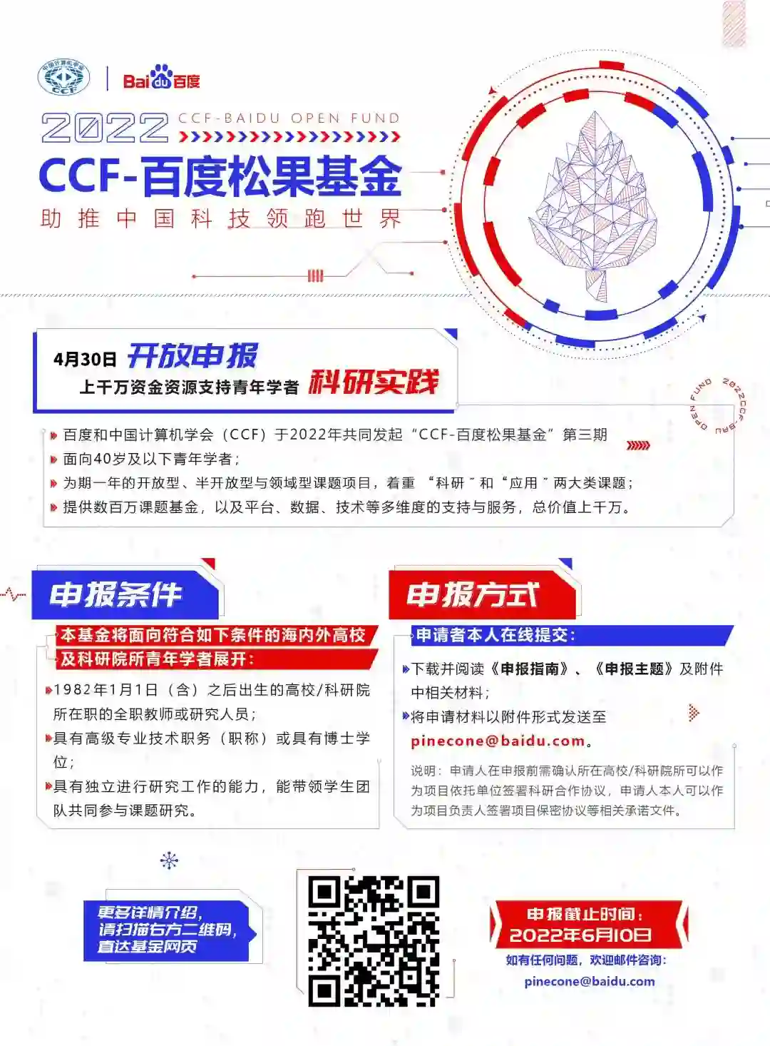 4月30日,2022年CCF-百度松果基金正式发布申报指南,共设立14个研究方向,提供数百万课题基金以及平台、数据、技术等多维度的支持与服务,即日起面向中国40岁及其以下青年学者开放申请。申报截止时间为2022年6月10日24:00。