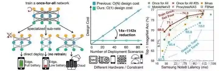 感觉是一个很好的思路,大部分NAS的主要时间到都花在验证/比较网络精度上,那么把这个时间都花在训练一个大网络上,然后再选所需要的小网络或许是一种更高效/性能更好的方式。Once for All使用的一些技巧也比较多,推荐大家看一下原paper:https://openreview.net/pdf?id=HylxE1HKwS