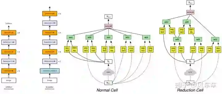 于是Google又出了一篇Learning Transferable Architectures for Scalable Image Recognition[CVPR'18,https//arxiv.org/pdf/1707.07012.pdf]。那我不搜整个结构,搜个cell然后堆起来就行了,反正VGG/Inception/ResNet也是这么干的,于是沿用了之前的思路,继续用RNN和policy gradient在新的搜索空间中寻找最佳的结构,在cifar上搜cell然后堆起来用到ImageNet上。搜索目标只包括两种cell,一种是normal cell,另一种reduction cell用于downsample,每个cell里面包括一些block,新的搜索空间包括选择这些block使用什么op,用什么作为输入等。之后很多工作都沿用了NASNet Search Space这个套路。