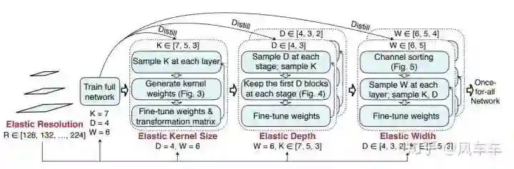 比较神奇的地方在于训完了之后不需要fine-tune就能取得很好的结果,应该是跟下面这种progressive shrinking的训练方式相关。如果再fine-tune精度会更高,openreview上的版本甚至比MobileNetV3高出4个点。
