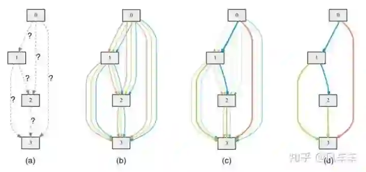 DARTS里面的一个cell,不同颜色的边表示不同的操作,颜色深浅表示不同的权重,最后留下权重最大的
