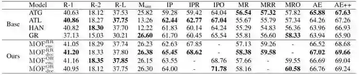 为了衡量我们提出的多模态基准指导的模型,我们同多个强基线模型进行了对比,包括融入全局或者局部视觉特征的多模态注意力机制的生成式自动文摘模型(ATG、ATL)、层次化的多模态自动文摘模型(HAN)以及基于图模型的抽取式自动文摘模型(GR)。