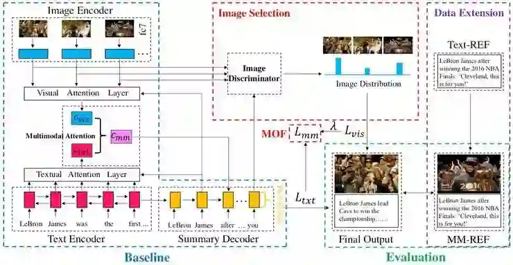 针对于上述问题,中科院自动化所自然语言处理组博士生朱军楠、周玉研究员、张家俊研究员、宗成庆研究员等提出了多模态基准指导的多模态自动文摘方法。基本想法是优化多模态摘要训练的目标函数,即在文本损失的基础上增加图片选择的损失函数。