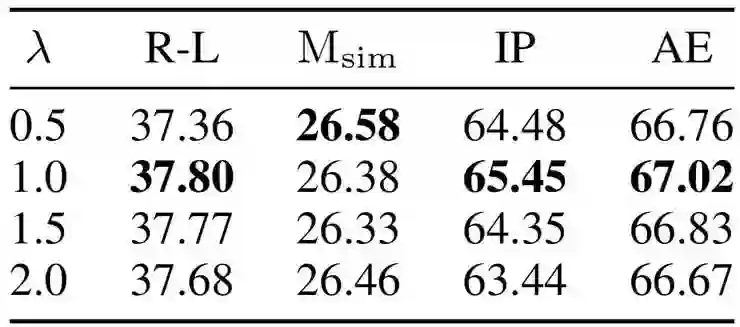 我们也对比了不同的图片选择损失函数权重对于模型性能的影响,可以看到当图片和文本的损失函数的权重都相同时,图文摘要的质量是最好的。