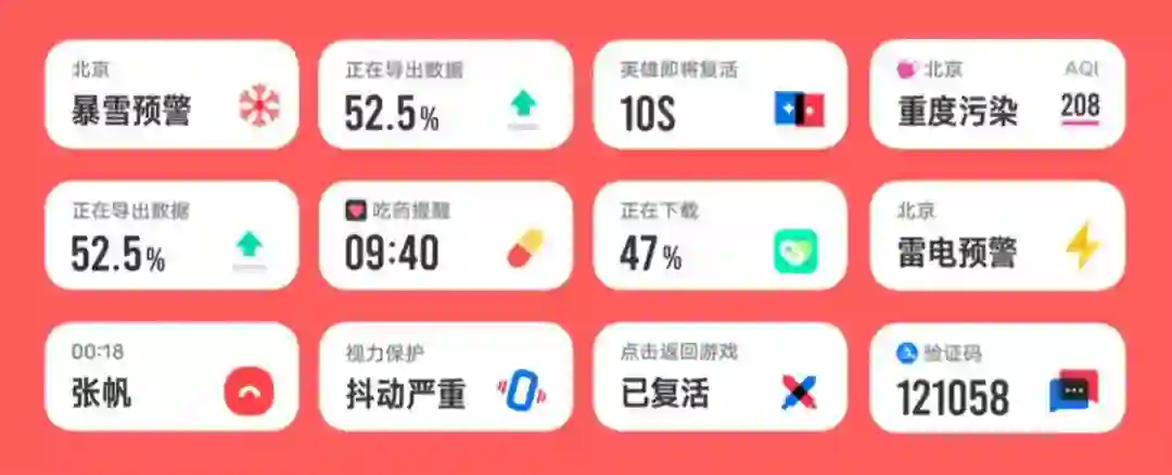 一方面,它的通知内容在原有的快递信息、出行航班信息、酒店信息、提醒事项的基础上,增加了打车信息、天气状况和更多生活提醒;另一方面,原本只存在于桌面组件的原子通知,现在还可以将关键信息突出呈现在通知中心顶部、或直接在状态栏中显示下载进度和短信验证码,效果类似于大家在其它系统中见到的关键权限调用提醒,直观又醒目。